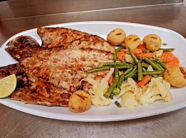 Dourada grelhada na brasa, acompanhado com batata cozida e legumes.
