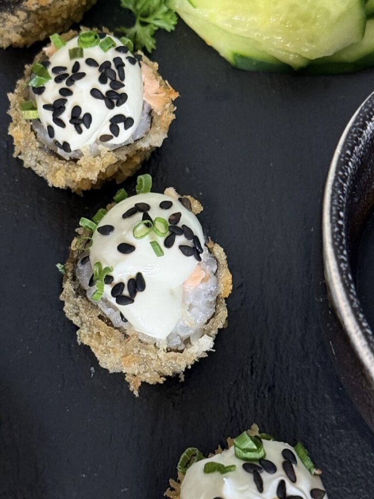 Mini-Hot Especial – 10 Unidades. Pequeno no tamanho, gigante no sabor! Sushi empanado e frito, recheado com o cremoso philadelphia, cebolinha fresca e um toque especial de gergelim torrado. Uma combinação perfeita de texturas e sabores!