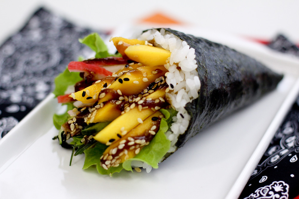 Temaki Califórnia: alga crocante recheada com arroz, manga fresca, pepino e nori. Uma opção refrescante e cheia de sabor!