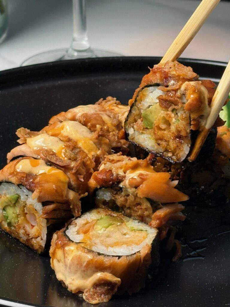 Uramaki Ebi Especial (10 unidades): enrolado de arroz, gergelim, camarão empanado, avocado, cebolinha e cream cheese Philadelphia, sobre posto com uma camada de salmão e Braseado. Com molhos especiais do Cheff. Uma explosão de sabores frescos e cremosos!